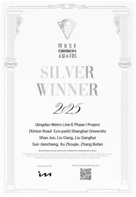 青島地鐵6號(hào)線一期工程空間一體化設(shè)計(jì)憑借卓越的一體化創(chuàng)意與深厚的文化表達(dá),榮獲2025年美國繆斯設(shè)計(jì)獎(jiǎng)(MUSE Design Awards)銀獎(jiǎng)。