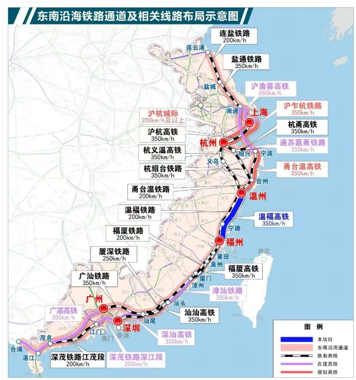 新建溫福高鐵與已開(kāi)通的福州至廈門(mén)高鐵、廣州至汕尾高鐵、汕頭至汕尾高鐵,正在建設(shè)的漳州至汕頭高鐵,規(guī)劃的寧波至溫州高鐵,將組成新的更高標(biāo)準(zhǔn)的寧波至廣州高鐵通道,路網(wǎng)地位十分重要。項(xiàng)目建成后,將與2013年全線貫通運(yùn)營(yíng)的既有杭州至深圳高鐵,形成聯(lián)通溫州與福州的高鐵雙通道,進(jìn)一步壓縮東南沿海城市間時(shí)空距離,密切長(zhǎng)三角與粵港澳大灣區(qū)的聯(lián)系,極大便利沿線人民群眾出行,對(duì)于加快推動(dòng)長(zhǎng)三角地區(qū)一體化發(fā)展和“海絲”核心區(qū)建設(shè),具有十分重要的意義。