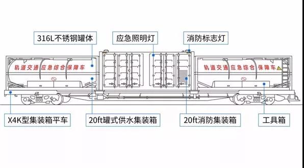 據(jù)介紹,軌道交通應(yīng)急綜合保障車的原型是一輛樸實(shí)無華的X4K型集裝箱平車,經(jīng)過加裝改造后配備了多功能高壓噴霧滅火裝置,1個(gè)消防集裝箱,2個(gè)罐式供水集裝箱,集裝箱總?cè)莘e達(dá)48立方米,還有照明系統(tǒng)、標(biāo)志燈具,警報(bào)器、接地裝置、隨車工具等。