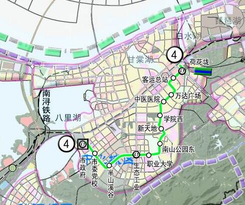 4號(hào)線: 起點(diǎn)為八里湖大道市政府站,經(jīng)興城大道、九園路、濂溪大道、木樨路、前進(jìn)東路、青年路、德化路、潯南大道后接入荷花垅站,線路全長(zhǎng)約13.38公里,設(shè)站12座。