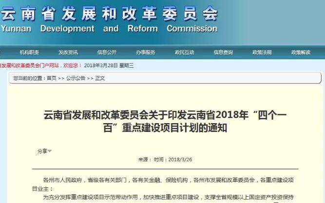 近日,云南省印發(fā)了《云南省2018年“四個一百”重點建設項目計劃》通知,重點加大綜合交通、能源、水利等五網(wǎng)基礎設施,八大重點產(chǎn)業(yè),新型城鎮(zhèn)化,教育、文體、衛(wèi)生等民生改善,資源節(jié)約和環(huán)境保護等項目建設。