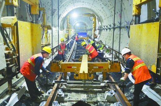 4月7日,長沙地鐵4號線一期工程河西段,工人正在加緊鋪設(shè)軌道。清明小長假期間,該線河西段400余名工人堅守施工一線,向本月底實現(xiàn)河西段雙線軌通的目標奮力邁進。