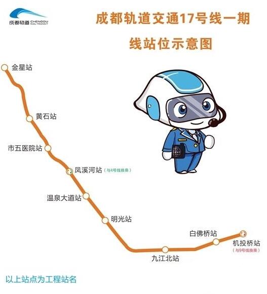 17號線是成都西部一條市域快線,運行速度目標值為每小時140公里。一期工程起于成都溫江區(qū)的金星站,止于成都武侯區(qū)的機投鎮(zhèn)站,線路全長約25公里,含高架段、地下段。根據(jù)成都地鐵規(guī)劃調(diào)整,在建17號線一期后期將分割為17號線和19號線,其中,機投橋至九江北為17號線,九江北至金星為19號線。