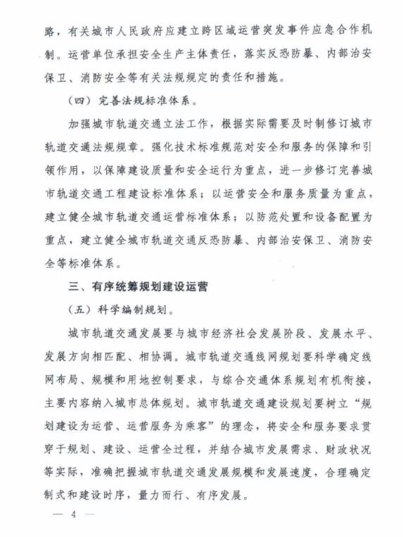 城市軌道交通發(fā)展要與城市經(jīng)濟社會發(fā)展階段、發(fā)展水平、發(fā)展方向相匹配、相協(xié)調(diào)。城市軌道交通線網(wǎng)規(guī)劃要科學(xué)確定線網(wǎng)布局、規(guī)模和用地控制要求, 與綜合交通體系規(guī)劃有機銜接,主要內(nèi)容納入城市總體規(guī)劃。城市軌道交通建設(shè)規(guī)劃要樹立"規(guī)劃建設(shè)為運營、運營服務(wù)為乘客"的理念,將安全和服務(wù)要求貫穿于規(guī)劃、建設(shè)、運營全過程,并結(jié)合城市發(fā)展需求、財政狀況等實際,準(zhǔn)確把握城市軌道交通發(fā)展規(guī)模和發(fā)展速度,合理確定制式和建設(shè)時序,量力而行、有序發(fā)展。