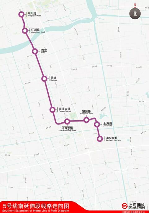 5號(hào)線南延伸工程全長(zhǎng)19.5公里,全線共設(shè)東川路站、江川路站、西渡站、蕭塘站、奉浦大道站、環(huán)城東路站、望園路站、金海湖站、奉賢新城站9座車站,預(yù)計(jì)2018年內(nèi)通車試運(yùn)營(yíng)。