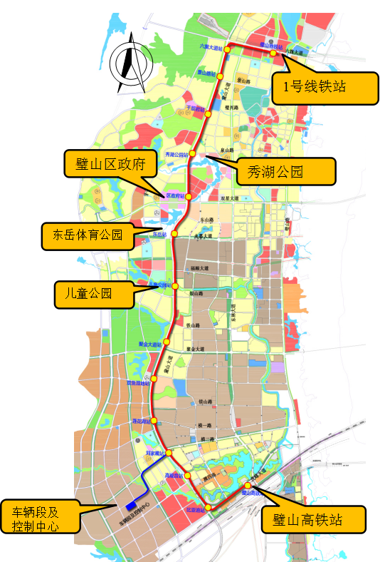 重慶市璧山區(qū)膠輪有軌電車建設(shè)項(xiàng)目可行性研究工程線路起點(diǎn)位于璧山高鐵站站前廣場(chǎng),終點(diǎn)位于地鐵1號(hào)線璧山站,附近也規(guī)劃了成渝高鐵中線璧山北站。線路沿虎峰大道、黛山大道、六旗大道布設(shè),串聯(lián)了璧山高鐵站、兒童公園、東岳體育公園、秀湖公園、璧山區(qū)政府、六旗樂(lè)園、璧山地鐵站,線路正線全長(zhǎng)16.05公里,車站15座,均為高架車站,平均站間距1131米,最大站間距1690米(位于聚金大道站~兒童公園站),最小站間距655米(位于景山路站~六旗大道站),設(shè)車輛段1座,位于比亞迪電池廠附近,設(shè)控制中心一座,與車輛段合設(shè)。預(yù)計(jì)2018年12月底開(kāi)工,2019年通車。
