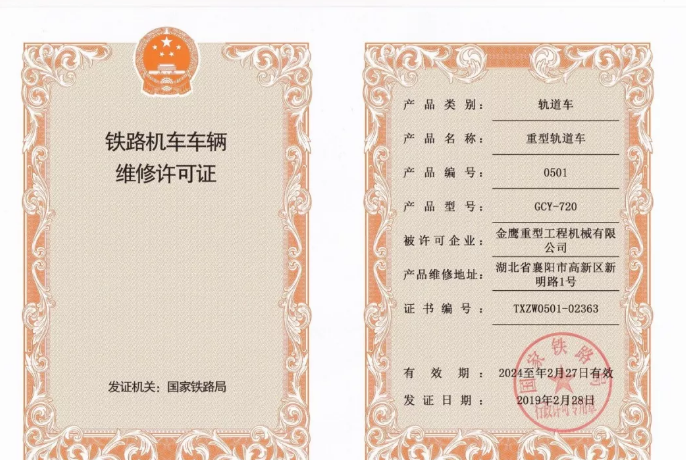 近日,國(guó)家鐵路局頒布了新的行政許可公告,金鷹重工喜獲GCY-720型重型軌道車維修許可證書。該證書的獲得標(biāo)志著公司產(chǎn)品大修能力再次獲得國(guó)家鐵路局認(rèn)可,公司產(chǎn)品維修資質(zhì)進(jìn)一步完善。截至目前公司共取得維修許可證22個(gè),基本涵蓋鐵路工程機(jī)械行業(yè)主流車型。