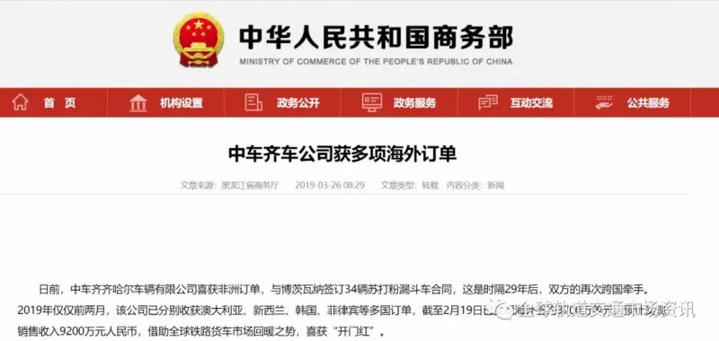 2019年僅僅前兩月,該公司已分別收獲澳大利亞、新西蘭、韓國、菲律賓等多國訂單,截至2月19日已實現(xiàn)海外簽約8700萬美元,預(yù)計實現(xiàn)銷售收入9200萬元人民幣,借助全球鐵路貨車市場回暖之勢,喜獲“開門紅”。