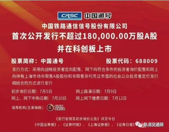 7月2日,鐵路通信信號股份有限公司(以下簡稱“通號”)公開披露《首次公開發(fā)行股票并在科創(chuàng)板上市招股意向書》,正式啟動科創(chuàng)板IPO發(fā)行工作,擬發(fā)行量不超過 180,000.00萬股,占發(fā)行后總股本17%,將成為登陸科創(chuàng)板的首家大型央企和A+H股的科創(chuàng)板上市公司。