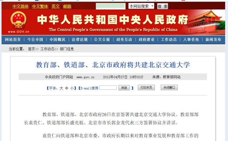 據(jù)了解,早在2012年4月26日,教育部、鐵道部、北京市政府就在京簽署共建北京交通大學協(xié)議。教育部部長袁貴仁、鐵道部部長盛光祖、北京市市長郭金龍代表三方簽署協(xié)議并講話。
