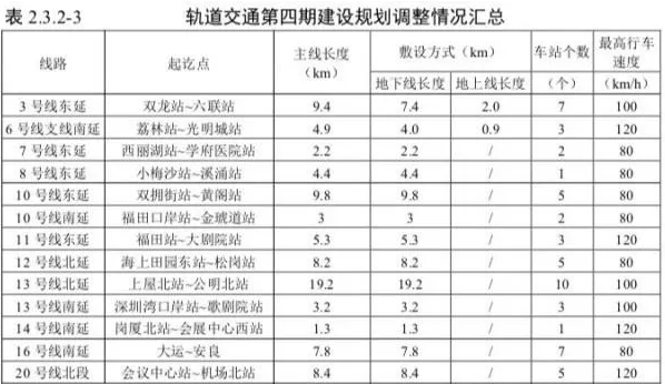 深圳市政府于2018年底啟動(dòng)編制的《深圳市城市軌道交通四期建設(shè)規(guī)劃調(diào)整(2017~2022)》,結(jié)合深圳市城市發(fā)展對(duì)軌道交通的需求緊迫性,最終確定第四期建設(shè)規(guī)劃調(diào)整(2017-2022)建設(shè)項(xiàng)目包括3號(hào)線東延、6號(hào)線支線南延、7號(hào)線東延、8號(hào)線東延、10號(hào)線東延、10號(hào)線南延、11號(hào)線東延、12號(hào)線北延、13號(hào)線北延、13號(hào)線南延、14號(hào)線南延、16號(hào)線南延、20號(hào)線北段共計(jì)11條線路,13個(gè)項(xiàng)目??傞L(zhǎng)約87.1公里,設(shè)站53座。其中地下段約84.2公里,高架段約2.9公里。