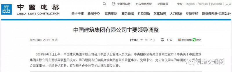 據(jù)建筑集團官網(wǎng)消息,9月2日上午,建筑集團有限公司召開中層以上管理人員大會。中央組織部有關負責同志宣布了中央關于建筑集團有限公司主要領導調(diào)整的決定:周乃翔同志任建筑集團有限公司董事長、黨組書記;免去官慶同志的建筑集團有限公司董事長、黨組書記職務。有關職務任免按有關法律和章程辦理。