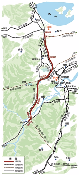 湖杭鐵路是杭州西站南北向引入的高鐵線路。北段湖州至杭州西是商合杭鐵路的組成部分,南段杭州西至桐廬既是杭黃鐵路連接線,又是杭溫鐵路的組成部分。線路從既有寧杭高鐵湖州站引出,經(jīng)湖州市南太湖新區(qū)、吳興區(qū)、德清縣,杭州市余杭區(qū)、西湖區(qū)、富陽區(qū)和桐廬縣,跨富春江新設桐廬東站后引入杭黃高鐵桐廬站,新建線路長135.788公里,總投資370.27億元(含同步實施工程),設計時速350公里。
