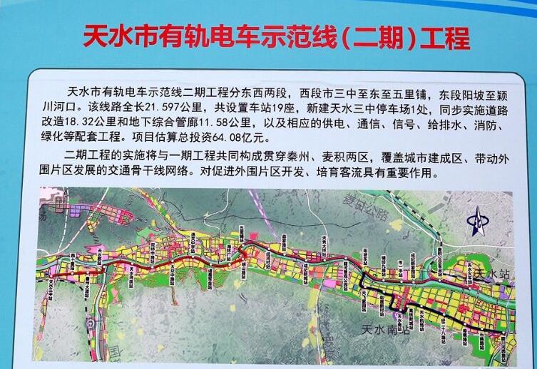 天水市有軌電車示范線二期工程分東西兩段,西段市三中—東五里鋪,東段陽(yáng)坡至穎川河口。該線路全長(zhǎng)21. 597公里,共設(shè)置車站19座,新建天水三中停車場(chǎng)1處,同步實(shí)施道路改造18.32公里和地下綜合管廊11.58公里,項(xiàng)目估算總投資64.08億元。