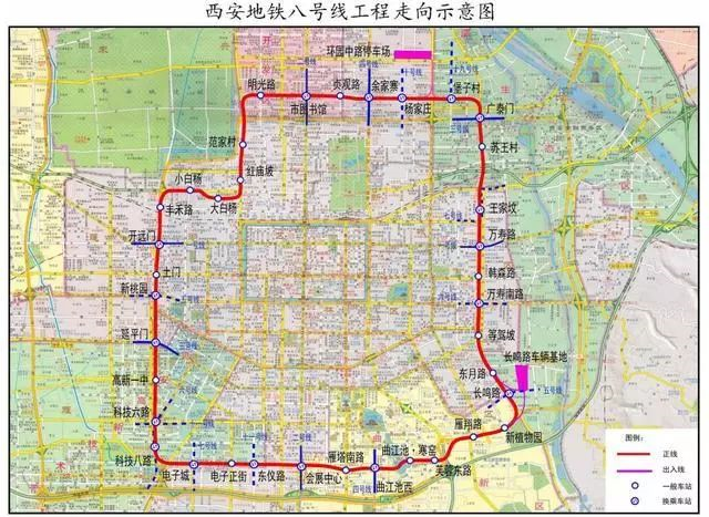 線路概述:西安地鐵8號線是線網(wǎng)中最重要的骨干線路,也是線網(wǎng)規(guī)劃中的唯一一條環(huán)線,貫穿雁塔、新城、灞橋、未央、蓮湖等5個行政區(qū)以及高新區(qū)、曲江新區(qū)、浐灞生態(tài)園區(qū)、經(jīng)開區(qū)、大興新區(qū)等5個開發(fā)新區(qū)。線路全長約49.89公里,均為地下線,共設(shè)站37座,其中換乘站18座,采用A型車和全自動駕駛系統(tǒng),實現(xiàn)與已運營的4條線和在建的5、6、9號線及規(guī)劃10、11、19號線換乘,建設(shè)年限為2019—2025年。