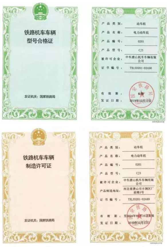 12月18日,中車唐山公司研制的CJ3型城際動(dòng)車組獲得由國(guó)家鐵路局頒發(fā)的型號(hào)合格證和制造許可證,產(chǎn)品編號(hào)0201,標(biāo)志著該型號(hào)動(dòng)車組具備批量生產(chǎn)和上線運(yùn)營(yíng)的條件,將為我國(guó)城際交通網(wǎng)絡(luò)和打造1小時(shí)“都市圈”再添新利器。